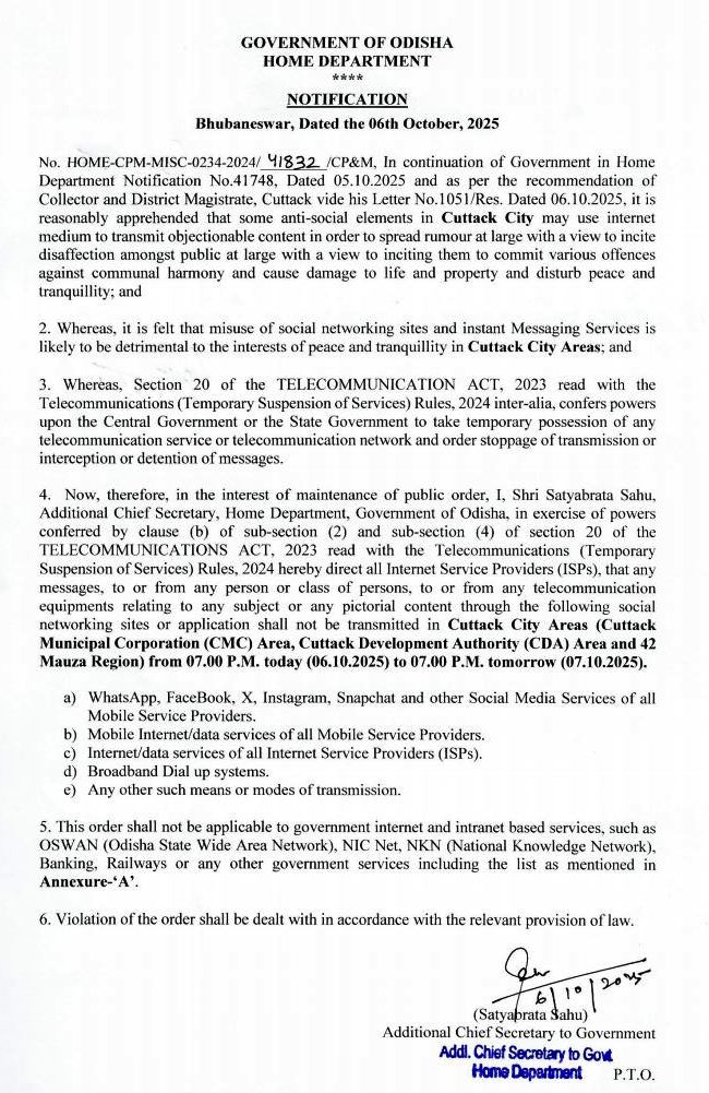 Internet Shutdown imposed in Cuttack, Odisha on 5th October 2025 to 7th October 2025 for …